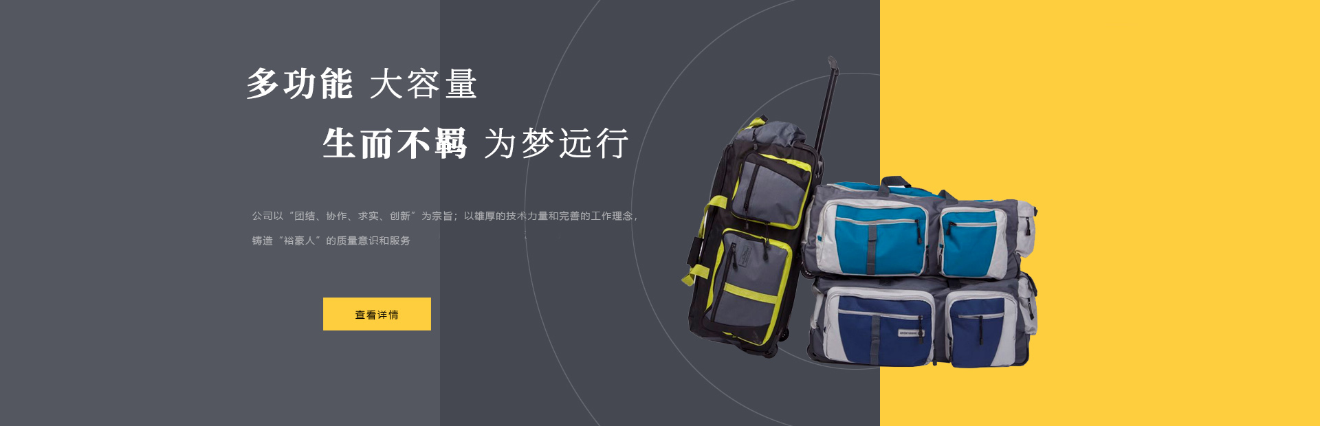 本公司是一家集設計,制造,加工,貿易為一體的專業(yè)箱包生產出口企業(yè)。已有20多年箱包生產經驗。公司廠區(qū)位于中國浙江省海寧市鹽官工業(yè)園區(qū),占地15000平方米,建筑面積10000平方米,員工150人,年生產能力260萬只(套)。 公司以尼龍,滌淪,牛津布,P...